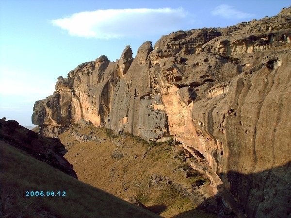 The cave is north-facing but the view towards the escarpment is blocked by the surrounding hills.  The hillside in front of the cave is coloured by orange watsonia blossoms in summer.  A fairly simple walk to the ridge above the cave will provide you with stunning views of the most southerly parts of the Drakensberg range. There is a spectacular dolerite dyke further up the valley from the cave.