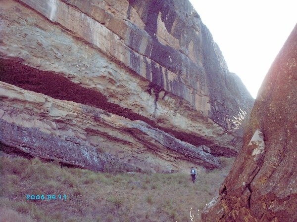 Bushman’s Nek Wilderness Area, lower southern Drakensberg.  There is a seldom-used path most of the way up to this cave from the Surprise Cave rock art site, but it is often vague and disappears for a while on the larger plateau nearest the cave. The escarpment approach from above the cave only offers a path for the last 100 metres or so. The cave is hard to miss – it is by far the longest continuous overhang in the entire Natal Drakensberg wilderness, well over 100 metres in length.  A fairly stiff 1 km uphill walk from the cave will take you past Goat’s Cave and into Lesotho.  After Ngwangwane Pass, this route provides the easiest access into the Mountain Kingdom of Lesotho – it is not even marked as a pass on maps of the area.