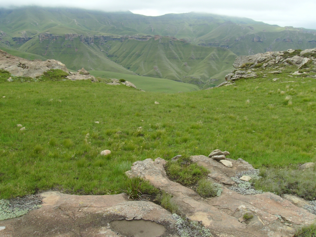 Bushman’s Nek Wilderness Area, lower southern Drakensberg.  There are two main routes to Tarn Cave, the first being via Bushman’s Nek Pass. After summitting the highest point on the pass, you will encounter a shipping container which might pass as a “border post” except there is no border guard there, just a watchman (sometimes) and a lot of litter. If you follow the jeep track round to the right behind the container, you will soon reach the border fence again, which you should then cross back into South Africa (the fence lies conveniently flat on the ground in places). If you can find your way to the largest tarn, you will pick up the path to Tarn Cave, which will now only be a few hundred metres away.