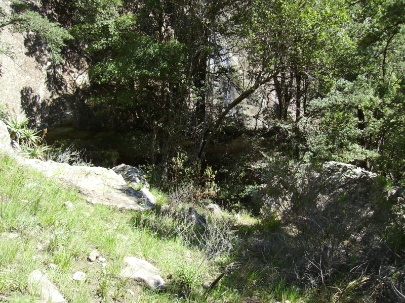 The trees and bushes hide any direct view outside the cave, but a short trip back along the approach route quickly exposes the gorge below and a section of the escarpment beyond the head of the valley.