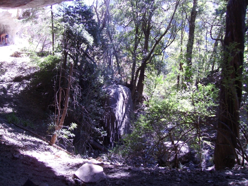 The trees and bushes hide any direct view outside the cave, but a short trip back along the approach route quickly exposes the gorge below and a section of the escarpment beyond the head of the valley.