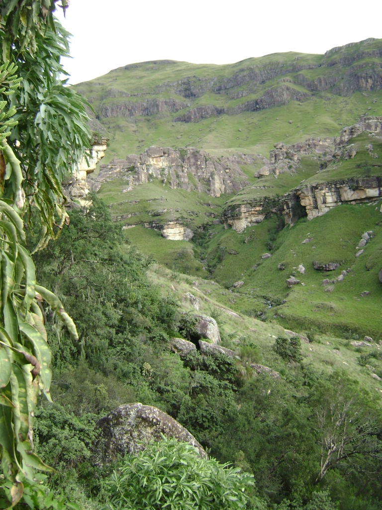 Cobham Wilderness Area, lower southern Drakensberg.  This magnificent cave is situated in a narrow valley overlooking some interesting rock formations.  Of all the lower berg caves, it is undoubtedly the most sheltered and the one most resembling a true cave.  It can be reached from Cobham via Emerald Stream and Pinnacle Rock, or via Ngenwa Pool.  Both routes offer fine scenery and swimming opportunities.  The cave also provides a very comfortable overnight stop for those planning to climb Masubsuba Pass the next day.  Alternatively, you can climb to the top of the Hub some 4 km further up the valley, then descend back down into the next valley south via Fingall’s Rock, where you can choose from Gorge Cave, Spectacle Cave or Pholela Cave for another overnight stay.  The only disadvantage of the cave’s location is that the last 200 metres involve a stiff uphill climb.  Fortunately this is usually sufficient to discourage its use by smugglers, although during heavy rain they may use it for a temporary shelter.