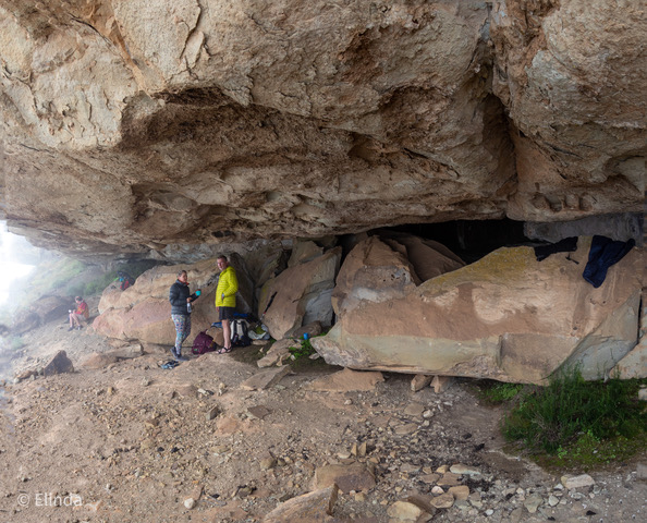 The caves are formed by deep overhangs which provide good shelter from the rain. However, their location near the top of a substantial ridge overlooking a large plateau means they are exposed to the wind. The recessed area in Cave 2 offers the most protection, but the wind can still make its way in via the narrow tunnel along the back wall.
