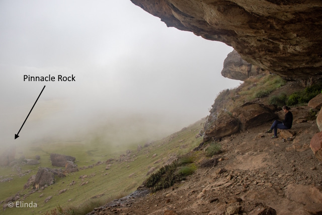 Cobham Wilderness Area, lower southern Drakensberg.  These two substantial overhangs are situated in the ridge above and behind Pinnacle Rock, but they have not been frequented by hikers so there are no paths to them. They can be accessed from the Pinnacle Rock side by choosing a route that offers the shallowest ascent. Alternatively, the caves can be approached from the Emerald Stream valley behind the ridge (as seen from Pinnacle Rock). Whichever option is chosen, water must be collected at the last reliable stream crossing before heading up to them. Accessing either cave involves a minor clamber, with the clamber for Cave 1 being some distance away, and the clamber for Cave 2 being immediately below it. The upper reaches of the hillside below both caves are quite steep and require careful negotiation when moving between the terraces.