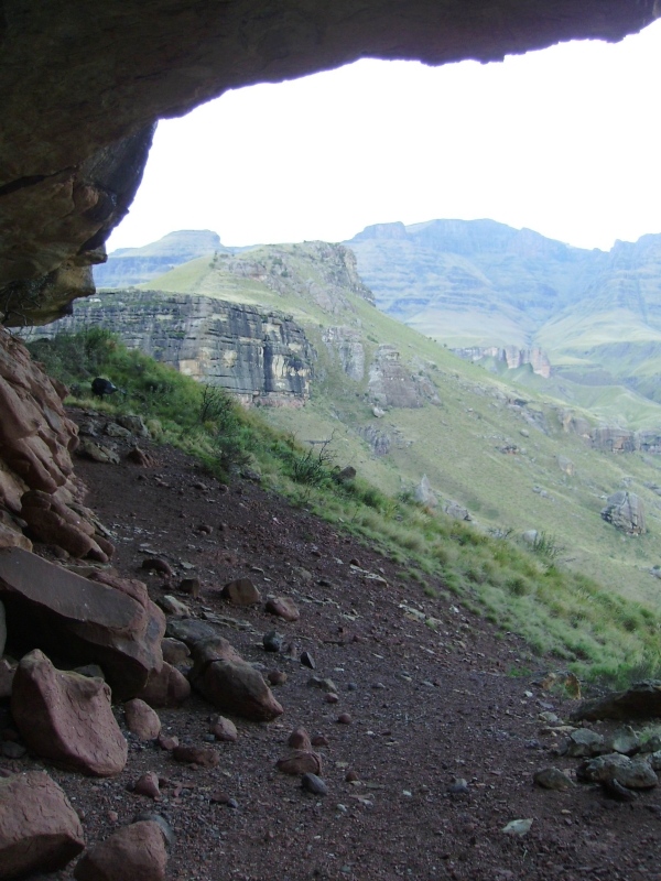 This is the cave’s main appeal. On a clear day fine views can be had of the escarpment from Mzimude Pass in the south to Rhino Peak in the north.