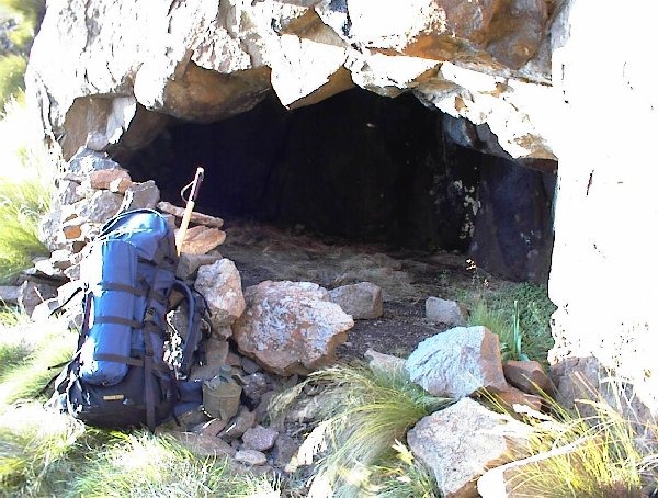 The route from Keith Bush camp is far more pleasant and within the capabilities of more hikers, especially if only on a day walk without full backpacks, but keep to the right going up the broad, rock-strewn slope. Both these routes come out at the top of the gully between Monk’s Cowl and Cathkin Peak. Reaching the cave from this point involves traversing around the south side of Monk’s Cowl at a height slightly above that of this first saddle. This traverse can be done safely in good weather, but in mist it could prove difficult to find a safe route. Once around the corner behind Monk’s Cowl, you then have to climb another gully for a further 150 m or so before arriving at the top of the saddle between Champagne Castle and Monk’s Cowl. The cave is small and in mist it may still be difficult to locate.