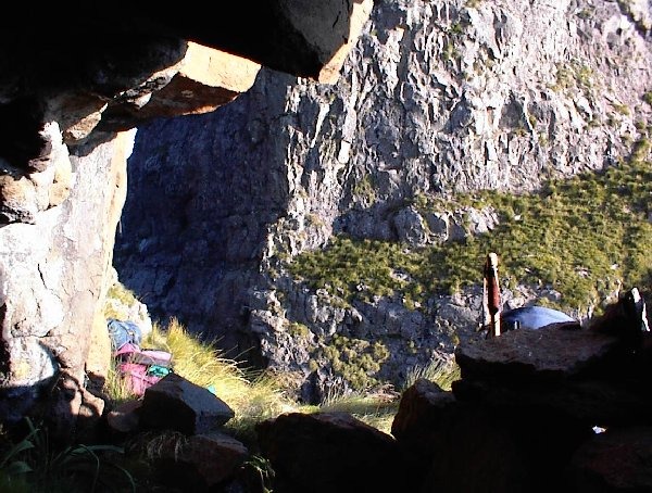 The route from Keith Bush camp is far more pleasant and within the capabilities of more hikers, especially if only on a day walk without full backpacks, but keep to the right going up the broad, rock-strewn slope. Both these routes come out at the top of the gully between Monk’s Cowl and Cathkin Peak. Reaching the cave from this point involves traversing around the south side of Monk’s Cowl at a height slightly above that of this first saddle. This traverse can be done safely in good weather, but in mist it could prove difficult to find a safe route. Once around the corner behind Monk’s Cowl, you then have to climb another gully for a further 150 m or so before arriving at the top of the saddle between Champagne Castle and Monk’s Cowl. The cave is small and in mist it may still be difficult to locate.