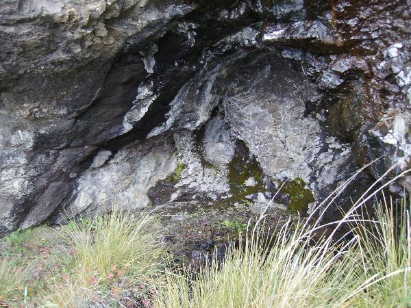 Nhlangeni Cave lies in basalt, but despite this it looks more like a sandstone overhang. In good, dry weather it could accommodate 6 hikers, but a more realistic year-round figure is 2 to 4. Close by is a small overhang referred to in the photographs above as Annex No.1 to the main cave. Even further out along the same rock face is another cave (Annex No.2) with a low stone wall which looks like it might offer better accommodation, but it is lies higher and further from the route up or down the pass and requires a clamber to reach.