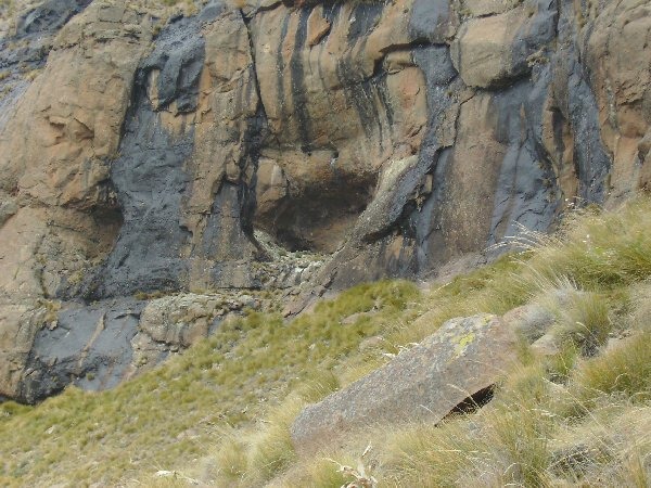 There is no running water near the cave, but in the height of the wet season this could possibly be collected from trickles running down the rock faces in the area. The nearest reliable water sources are about 1 km down the pass below the cave, or 1 km from the top of the pass in Lesotho.