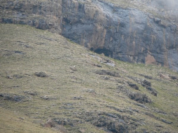 The cave faces across the very wide slope of Nhlangeni Pass onto the rock wall beyond.  This projects outwards from the escarpment, culminating in Mohlesi Peak. Overall it is a pleasing but relatively plain outlook.