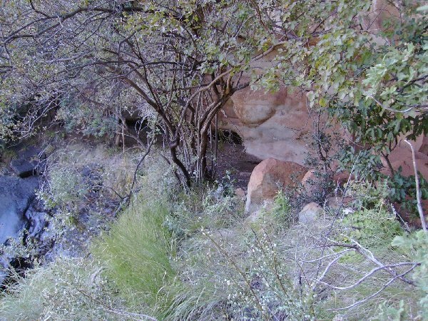 Shelter Cave is a long, low overhang with some nice, level floor areas that can accommodate 6 to 8 hikers comfortably.