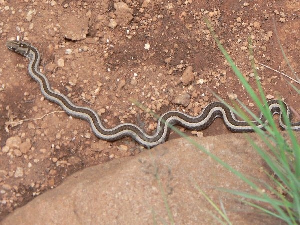 The skaapsteker is the most common non-poisonous snake encountered in the berg.  It relies on its striping to blend in with the grass. This often works well because it is a very slender snake. When caught in the open, it may rear up its front end like a rinkhals, but it cannot form a flat hood like the latter. It is mimicked in its colouration and behaviour by the legless lizard.