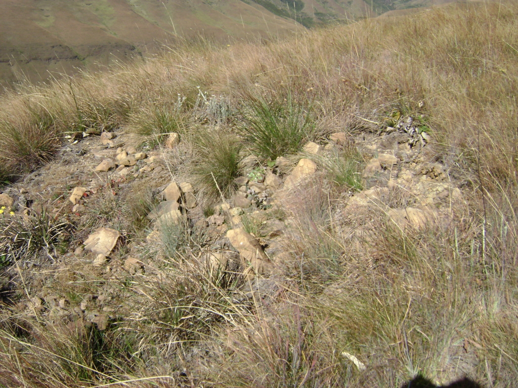 This large lightning scar was photographed on Middle Ridge, Giant's Castle, in May 2021. The strike probably happened during the 2020-21 summer season. The intense heat of the lightning instantly vapourises any water in the soil and rock. The resulting burst of super-heated steam blasts away the material at the strike point.